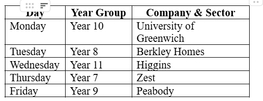 A key highlight of the week was the bespoke programme of virtual assemblies, designed in collaboration with leading employers and Peabody Housing Association to fully meet Gatsby Benchmark 5 – Experience with Employers and Employees. The schedule is as follows: